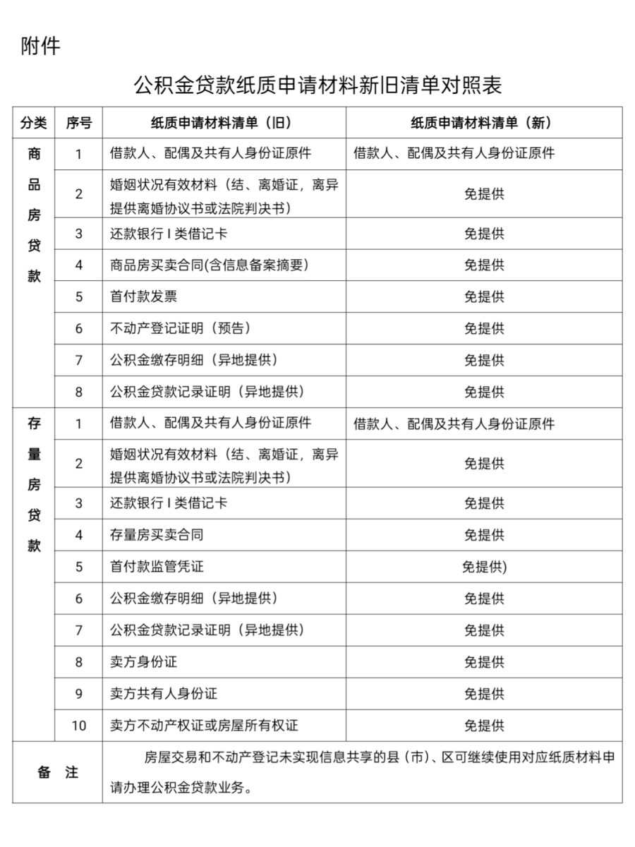 對于部分未實現房屋交易和不動產登記信息共享的縣(市)、區,可繼續使用對應的紙質材料申請辦理公積金貸款。需注意的是,“一證辦”適用范圍不包含“商轉公貸款”業務。